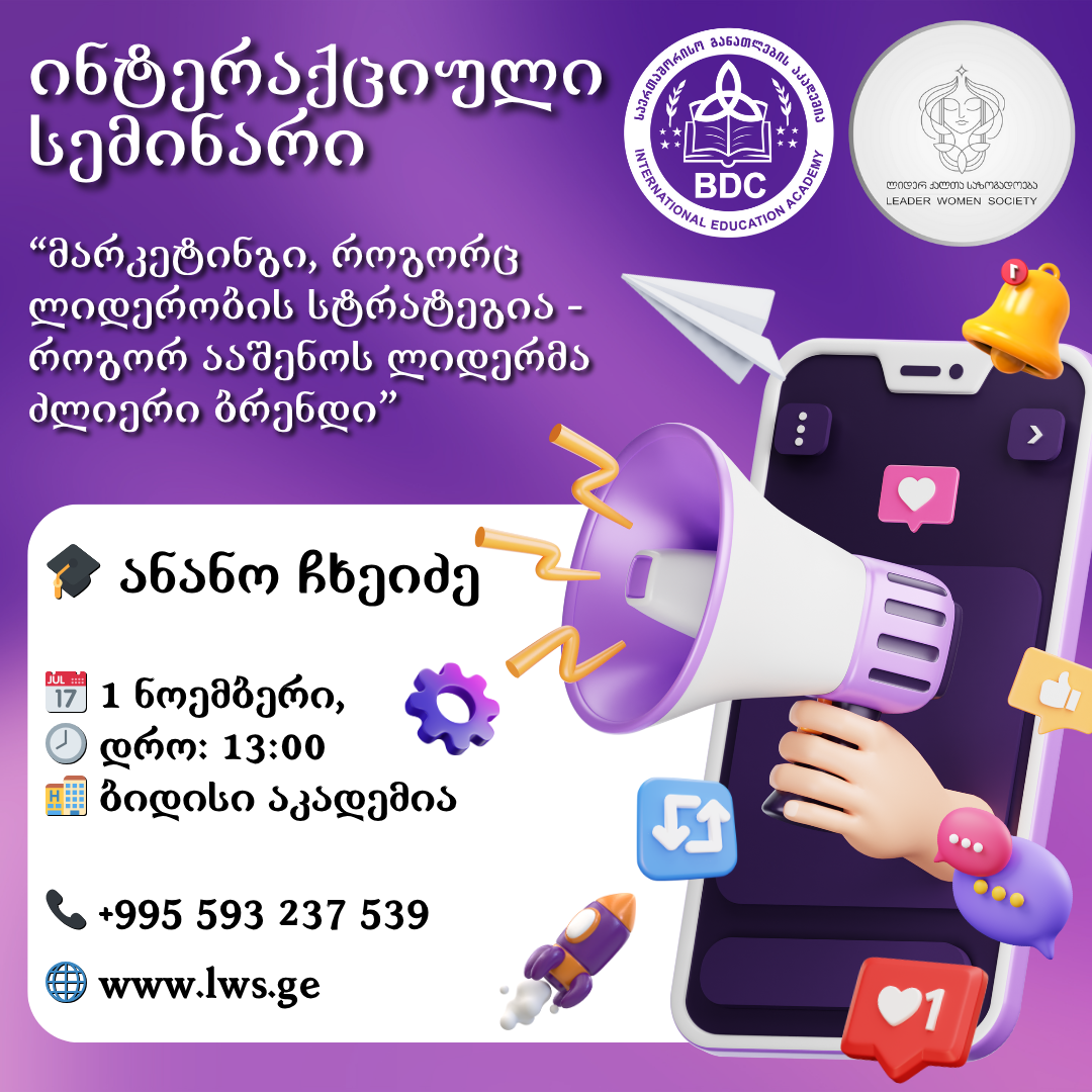🎓 „ლიდერ ქალთა საზოგადოება” და საერთაშორისო განათლების აკადემია „ბიდისი” წარმოგიდგენთ ინტერაქციულ სემინარს, თემაზე: „მარკეტინგი, როგორც ლიდერობის სტრატეგია – როგორ ააშენოს ლიდერმა ძლიერი ბრენდი”