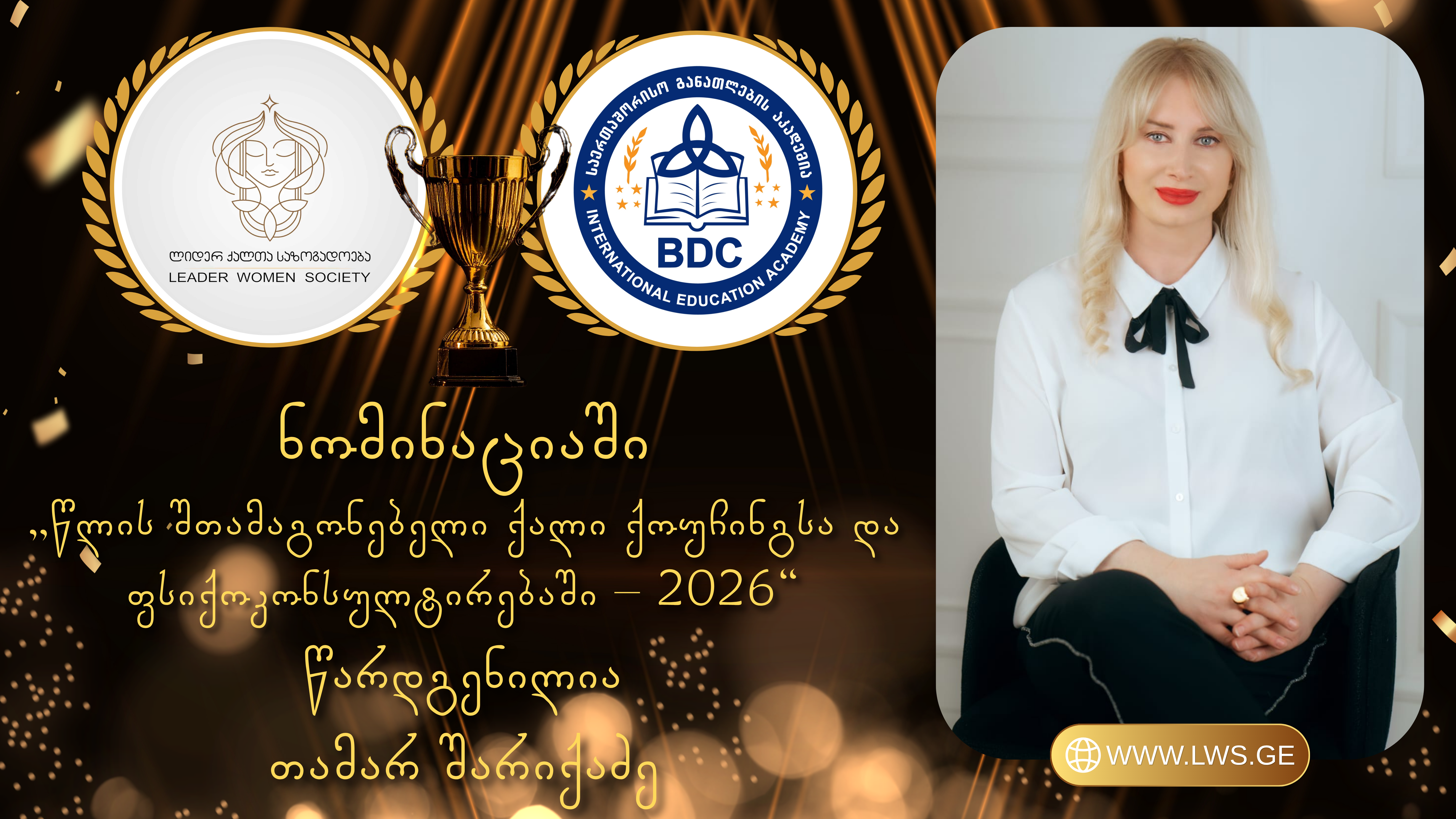 ნომინაციაში „წლის შთამაგონებელი ქალი ქოუჩინგსა და ფსიქოკონსულტირებაში – 2026“ წარდგენილია თამარ შარიქაძე