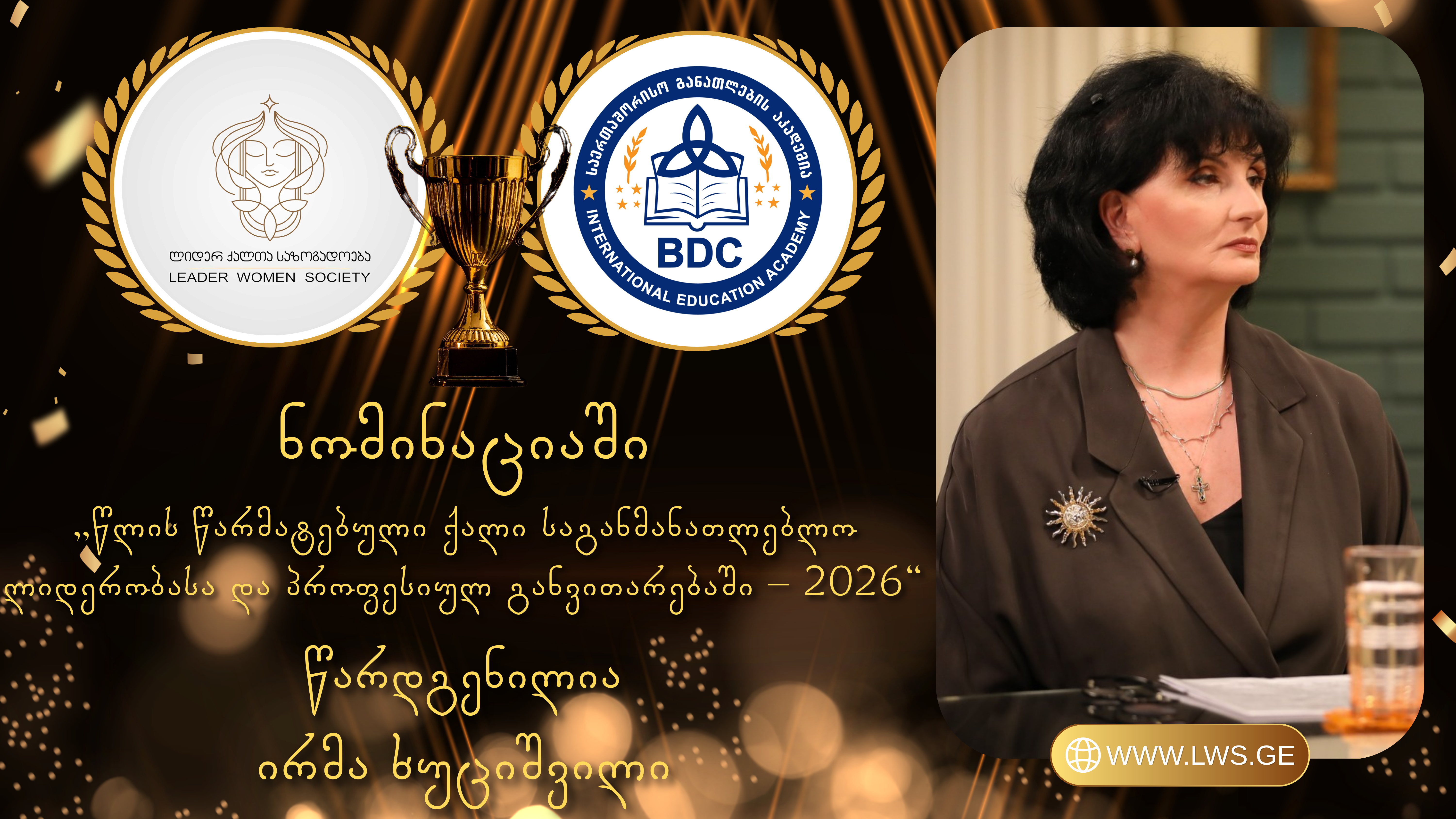 ნომინაციაში „წლის წარმატებული ქალი საგანმანათლებლო ლიდერობასა და პროფესიულ განვითარებაში – 2026“ წარდგენილია ირმა ხუციშვილი